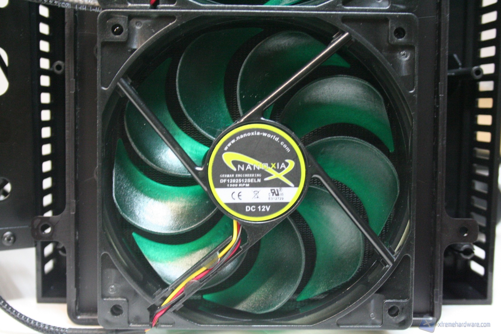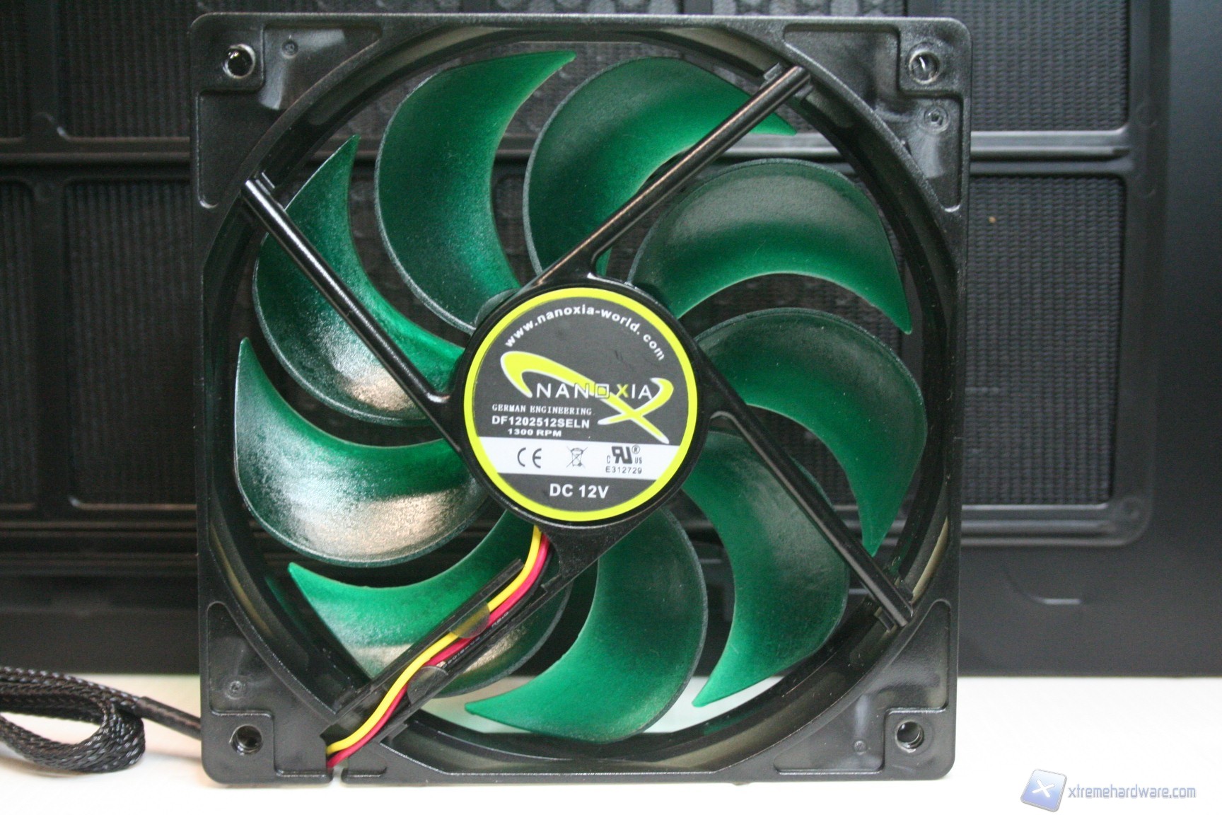 Teoricamente la configurazione stock permette una dissipazione termica decente, anche se l’orientamento è per sistemi fonoisolati e quindi per gli amanti del silenzio. Il numero di ventole interne però è buono, come la loro tipologia. Sono proprietarie Nanoxia, dalle discrete caratteristiche tecniche e la loro adozione non permetterà l’aumento di temperature per le singole componenti, dato che sono raffreddate in modo attivo (MOSFET’s di alimentazione, hard disk e porzioni secondarie tra cui le RAM). Al fine di migliorare ulteriormente le performance della GPU è permessa l’installazione di due ventole addizionali, o di un radiatore da 240mm, che permetteranno quindi una ventilazione più che adeguata. Ovviamente l’installazione in questo settore porterà ad una compatibilità inferiore con schede molto lunghe, ma in questo caso di spazio ce n’è a sufficienza anche per delle dual-GPU.