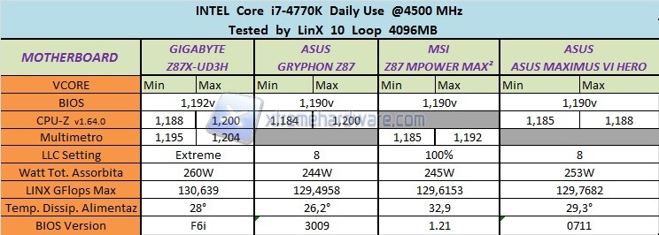 Causa la mancanza  di punti per la rilevazione delle tensioni sulla scheda madre, ci siamo avvalsi del noto tool CPU-Z (aggiornato alla release 1.64) per la rilevazione e la stabilizzazione della frequenza del processore in tempo reale. Le misurazioni sono state effettuate con il sistema sotto carico tramite LinX utilizzando come riferimento la frequenza limite di 4500MHz, la stessa frequenza è stata impostata da BIOS anche per altri modelli di schede anche di altri brand. Ovviamente per superare il test dei 10 cicli sotto LinX con il quantitativo impostato di memoria di 4096MB ogni scheda ha richiesto da BIOS, per poter chiudere il test senza errori, un determinato voltaggio. Al fine di rendere attendibile il test e porre le schede sullo stesso piano per verificarne la sezione di alimentazione e quindi la singola capacità di stabilizzare il Vcore erogato riducendo al minimo il Vdroop, siamo intervenuti sul LoadLineCalibration settandolo al massimo possibile, così da mettere sullo stesso piano l’intervento della sezione di alimentazione delle varie motherboard. Il profilo LLC impostato al livello 8 (e quindi al massimo possibile) da BIOS sulla ASUS MAXIMUS VI HERO ci ha permesso di  rilevare un comportamento della scheda madre stabile con un Vdroop di soli 0,003 volt, purtroppo rilevato sotto carico solo tramite il tool CPU-Z e non tramite Multimetro Digitale. Lo scopo del test mira principalmente a comparare le schede sul piano dei GFlops massimi generati. In secondo luogo viene analizzato l’aspetto delle tensioni erogate ed il relativo Vdroop in un’ottica di efficienza del sistema di alimentazione. Ci sembra giusto chiudere il quadro andando a rilevare i consumi del sistema nella sua complessità (a parità di hardware). Ricordiamo che l’importanza del circuito di alimentazione è direttamente proporzionale alla capacità computazionale espressa da LinX, poiché a determinate frequenze limite il processore assorbe un notevole quantitativo di corrente e se la sezione di alimentazione della motherboard non riesce a far fronte alla richiesta di corrente, il valore computazionale di Lynx rimane basso. Di solito su molte altre schede madri con una sezione di alimentazione non all’altezza, per cercare di chiudere il test ad una data frequenza, si cerca di compensare aumentando il voltaggio (Vcore) applicato al processore, ma ci si scontra con il problema della temperatura. Di seguito la tabella riepilogativa dei risultati ottenuti: