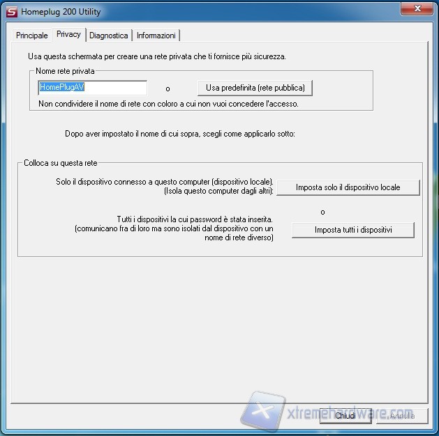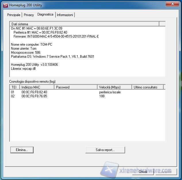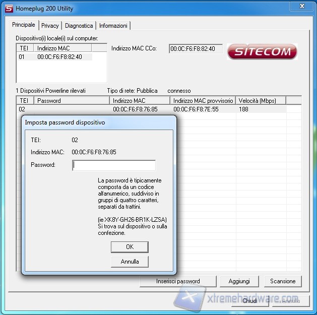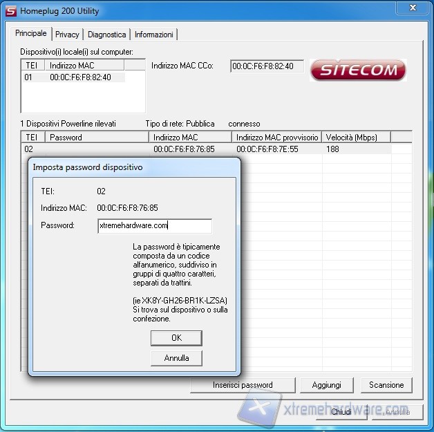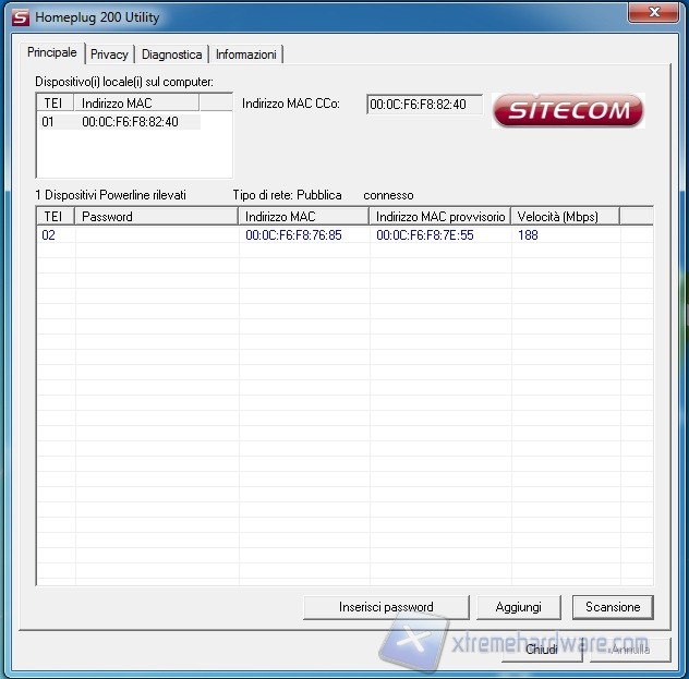 Come notiamo ci vengono riportate le informazioni inerenti ai Powerline connessi.  Sempre da questa schermata abbiamo la possibilità di inserire una password o di aggiungere un nuovo powerline con la relativa password.